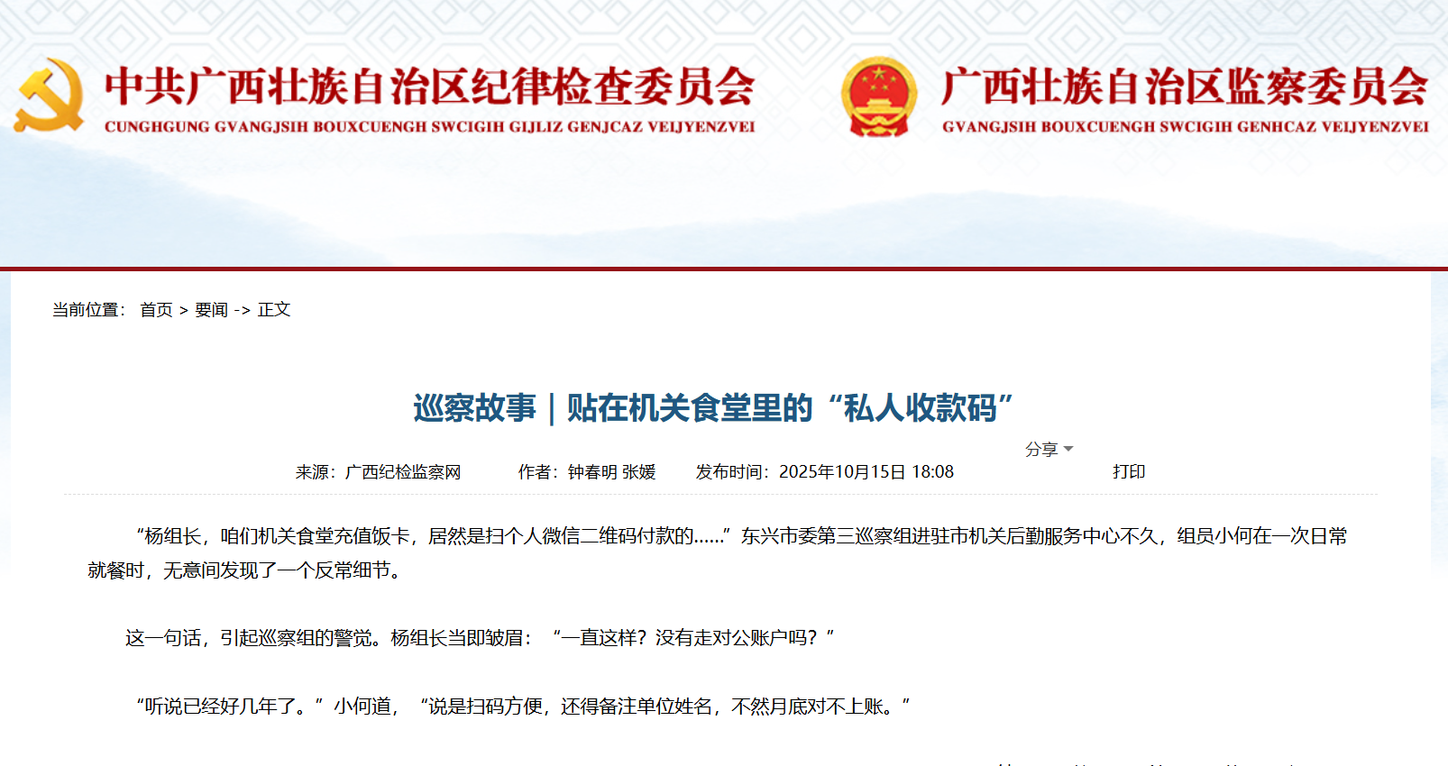 廣西紀(jì)檢監(jiān)察網(wǎng)|巡察故事|貼在機關(guān)食堂里的“私人收款碼”